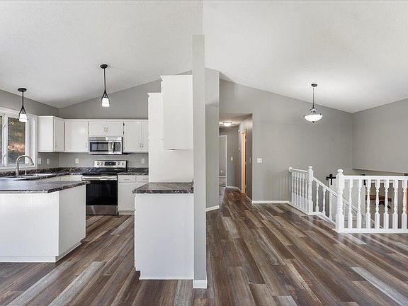 This spacious split-entry home features a bright and open layout with stylish finishes. The main level offers vaulted ceilings, an updated kitchen, and durable modern flooring. Enjoy cozy evenings in the lower-level family room with a fireplace and built-in cabinetry.