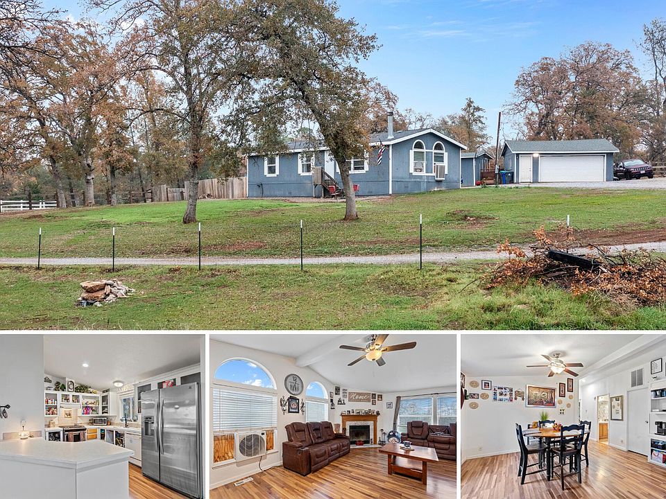 Charming 2-bed, 2-bath manufactured home on a permanent foundation, perched atop a knoll for peek a boo views of the western mountains and the picturesque oak-studded property. The residence showcases an inviting open layout with expansive windows, vaulted ceilings, and a warm wood-burning stove. A generously sized, centrally located kitchen, indoor laundry, and ceiling fans enhance the living experience. Additional amenities include a detached 2-car garage, a well-equipped pump house with a workbench and shelves, RV parking with 50 amp full hookups, and a fenced and cross-fenced property, providing ample space for animals. Enjoy a tranquil lifestyle surrounded by nature's beauty.