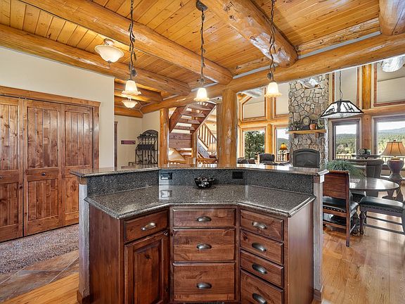 Listed by Austin Stiles, KWBH, 605-391-4820. Dreaming of a luxury log cabin style home in the desirable Apple Springs Subdivision? Look no further! This beautiful home blends quality living with rustic design at every turn *The fantastic open concept main level has a large corner kitchen that flows into the living and dining areas, allowing for seamless entertaining *The well appointed kitchen has custom cabinetry, granite countertops, stainless steel appliances and a multi-level breakfast bar for storage and seating *Picture friends and family in the spacious living room, relaxing around the fireplace with stone surround, enjoying views of the Black Hills through the wall of south facing windows *This home offers TWO main level primary suites, each with a large bedroom with private deck access, an ensuite bathroom with walk in shower and a walk in closet *Take the unique log staircase up to the multi-use loft area with great views on either side *The walkout basement level has a large family room with covered patio access and the home's 2nd fireplace, 3 additional bedrooms and 1 full bathroom for family or guests *Convenient laundry room and great storage complete this level *Enjoy views of the golf course and beautiful Black Hills from the raised wrap around deck off the back of the home perfect for time spent with friends or evenings under the stars *Covered ground level patio for added entertaining space *Detached 2-car garage is heated and oversized (cont.)