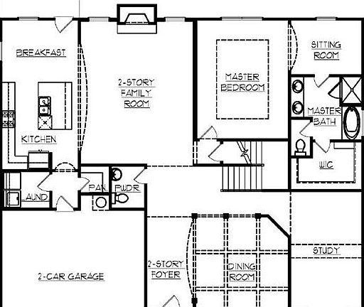 The Benjamine B floor plan by Kerley Family Homes. Entrance Foyer has arch way to the elegant Dining Room with coffered ceiling, Study with vaulted ceiling. Chef's Kitchen with miles of granite counters, walk-in pantry, island with breakfast bar, Breakfast Room, and full view to the roomy 2 story Family Room. First floor Master Suite with sitting room and large closet. Upstairs is an additional bedroom suite, and 2 additional large bedrooms. Builder's 2-10 warranty and installation of the Pestban system are standard.