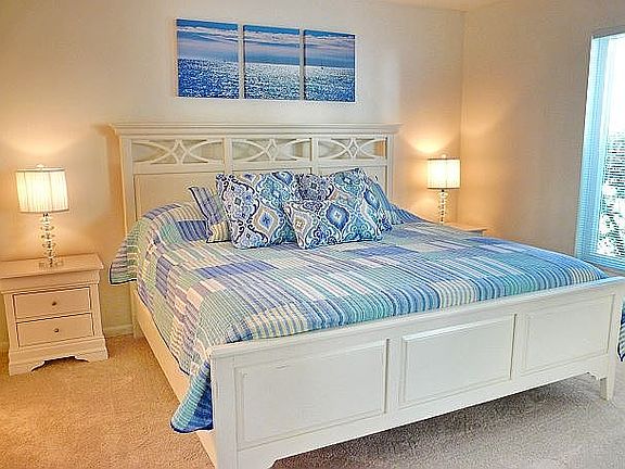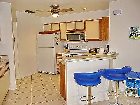 Bright ocean-themed interiorLush tropical gardensFully stocked summer kitchenRare three-bedroom two-bath condo