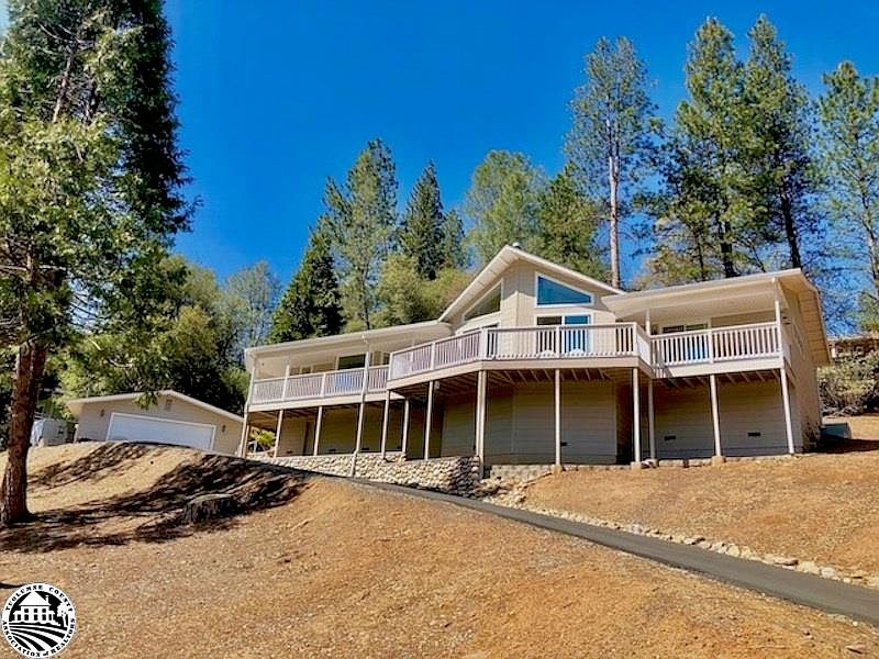 Like NEW- must see - pride of ownership shines in this single level, fabulous home in the mountains with 180 degree views, fabulous wrap around covered lighted deck balcony, just a few of the amazing features of this 2005 year built custom upgraded home in beautiful Pine Mountain Lake, on .629 acres with neighboring houses at a distance. This stunning bright crisp and clean impressive home has 3 bedrooms, 2 & ½ baths, 2 car detached garage, Trex deck lighted gentle sloped ramp allowing no steps or stairs to home entrance and adorned by river rock stone accent inside and out. The living area, dining and kitchen are extremely open and surrounded by windows looking out to natural beautiful tree view landscape, brilliant blue skies and amazing sunsets. The large open kitchen has granite counters w/tile accent, custom high-end knot wood cabinets with roller tracking drawers, 4 drawer pull out pantry shelving, turn style storage, glass hutch built-in and under cabinet lights. Nearby kitchen open spacious dining area with beautiful windows that overlook covered walkway balcony terrace and a convenient guest ½ bath w/granite counter/vanity, large laundry room and separate kitchen entry door. Bedrooms and Living Rm have New European reclaimed "style" 7.25" wide, wire brushed oak flooring. The living area features 13' tall cathedral ceilings and 13' faux river rock with high-end "Vermont Castings" gas fireplace, double 6' wide view windows and custom sky windows. All other rooms are 9' tall with double pane windows, crown molding, new ceiling fan/lights and main living area has elegant LED recessed lighting on dimmers. 12"x16" ceramic stone tile flooring in kitchen and baths with matching counters in bathrooms. The Master Bdrm has beautiful custom dual French style leaded glass doors with privacy blinds, custom designed walk-in closet dual sided with cedar planked ceiling, white crown moulding, designer built-in soft close cabinet drawers, custom shelving and hanging racks, LED lighting. The MBrm also has a sliding door to private balcony. MBa w/ dual sinks, soaker tub and separate shower with tile and travertine stone inlay and seamless glass shower. Newer window coverings and crown molding throughout along with fresh interior paint. 2 guest bedrooms, one w/ mirror closets and the other used as desk alcove but can be closet utilized. Hall bath has stone counter and rain glass brushed nickel shower enclosure. A move in condition mountain home in a beautiful setting, centrally located a block from Pine Mountain Dr. and easy access to all HOA amenities including seasonal Big Creek walking/hiking and biking trail ¼ mile accessible from house and 35 miles from majestic Yosemite National Park. Pine Mountain Lake gated community HOA amenities include Lake and marina with 3 beaches, 18 hole golf course with country club, restaurant/bar, golf shop, swimming pool, pickleball and tennis courts, airport, horse stables, shooting and archery ranges, playgrounds, lake lodge and annual 4th of July fireworks. Fun for the entire family and just 2 hours from the hustle bustle central valley and Bay Area.