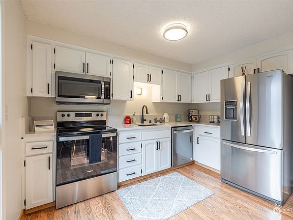 Welcome Home to your spacious condo in the Edmonds area. This is a ground floor unit. The entry opens to a cozy living room with an adorable wood stove. Kitchen has been updated with new quarts ct, new stainless appliances, Utility room with Washer @Dryer, Enjoy a meal at the eat-in kitchen with acccess to a large patio, perfect for container gardening and morning coffee. First floor bathroom also has been updated. Upstairs there are two sizable bedrooms with good closet space. Main full bath has also been redone with high end fixtures and tile floors. Skyslight in both bathrm. Relax in you personal sauna inside the unit. New low E windows with safety latches. Carperts are freshly cleaned. two deeded parking spaces.
