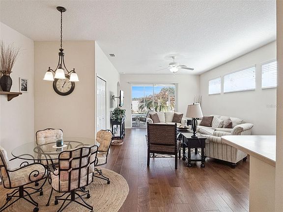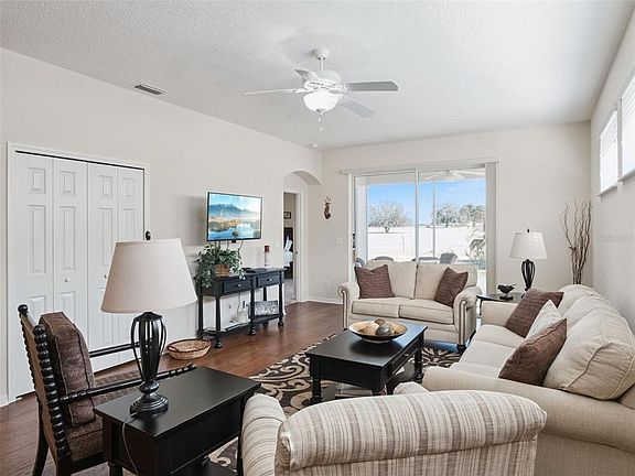 Welcome to your dream home in the sought-after 55+ Royal Highlands golf community in Lake County, Central Florida! This beautifully maintained three-bedroom, two-bath Carlisle Model sits on a premium lot with professional landscaping and serene pastureland views. Enjoy relaxing mornings or evenings on your screened lanai, taking in the peaceful scenery and lush surroundings. Step inside to an inviting open floor plan with hickory hardwood floors, quartz countertops, and fresh updates—including a 2025 new roof and water heater for worry-free living. The spacious kitchen is a chef’s delight, featuring Corian countertops, a gas range, pantry, breakfast bar, under-sink water filter, and a cozy breakfast nook with a charming bay window. Additional thoughtful touches include extra storage throughout, inside laundry with appliances, vertical blinds, and marble windowsills. The owner’s suite offers a walk-in closet, step-in shower, and dual vanity for your comfort. This home has seen only half-year occupancy, ensuring it feels fresh and lightly lived in. You’ll appreciate the privacy, energy efficiency, knockdown ceilings, transferable termite bond, and absence of pets or smokers. Furniture may be available for your convenience—just move right in! Enjoy low HOA fees and access to exceptional amenities: indoor and outdoor pools, an 18-hole golf course, fitness center, craft rooms, softball, a library, a clubhouse with a restaurant, endless social activities, and more. Located close to Orlando International Airport (MCO), medical facilities, The Village Squares, Florida Turnpike, amusement parks, and all the attractions Central Florida has to offer. Don’t miss your chance to join this vibrant, active community and make this stunning home your own. Schedule your private showing today!