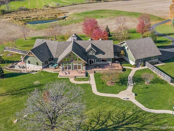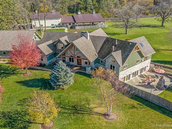 One of a kind custom home feels like a magnificent private retreat on 30 ACRES is surrounded by rolling land, trees, 3 ponds, and farmland, just 7 minutes north of town. Plus a 5,000 SQ FT out building with 2,000 SQ FT shop area including FULL RV hook-up, radiant heat, A/C, kitchen, office, bath, impressive 14 stall kennel. And Tesla hook-up in attached 3 car garage. This stunning custom River Bend Timber Frame WALK OUT RANCH home was built in 2007 and features privacy and luxury. 4 bedrooms, 3.1 baths, OFFICE. 2 bedrooms on the main level and 2 bedrooms in the walk out lower level, with radiant floors throughout both levels in home and outbuilding. Main level master suite with fireplace, amazing master bath and huge walk in closet and private slider access to hot tub from master suite. Beautiful large covered porch. Floor to ceiling fireplace in foyer with a true great room on the other side welcome guests into this serene home. Dream kitchen to delight any chef with an expansive center island to fit all of your guests. Sunroom overlooking the backyard with a freestanding gas FIREPLACE and surrounded by sliding doors, leads to a large deck perfect for entertaining. Lower level features 2 additional bedrooms, 2 large storage rooms plus storage closets, lower level family room, wet bar area, sliders leading to the large patio area with brick outdoor fireplace and stunning views. New hot tub will be delivered Winter 2020. Please note, a Virtual 3D Tour and Video of the entire home is available for you to view!