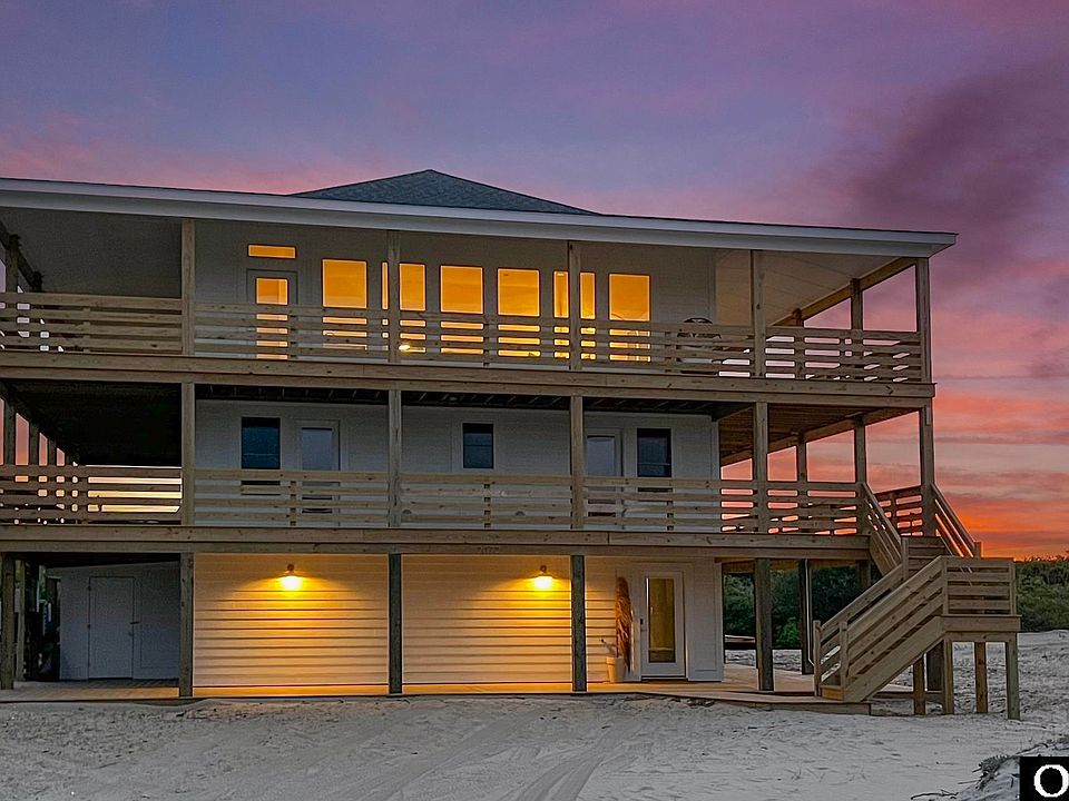 Welcome to The White Lotus - a bespoke coastal retreat and rental machine where driftwood and linen meet the sea. Perched high above the Atlantic in the wild and wonderful 4-Wheel Drive area of Carova, this brand-new home offers sweeping ocean views and a perfect blend of strength and sophistication. The home is now fully booked for its premier summer season and is an AirBnB "Guest Favorite," having received seven straight 5-STAR REVIEWS (AirBnB Link: https://www.airbnb.com/l/QNuHU5JA). The top level stuns with a spacious open-concept living area, anchored by a sleek fireplace adorned with custom tilework. A pristine kitchen showcases snowy white quartz countertops, complemented by top-of-the-line white and gold appliances. Underfoot, oversized organic rugs ground a custom leather L-shaped sofa and a striking live-edge dining table crafted from raw quartz and epoxy. Wraparound 10-foot decks embrace the home, offering 360-degree outdoor living and seamless entertaining in every season. On the mid-level, three serene bedrooms invite you to drift away. Each is wrapped in imported grasscloth wallpaper and accented with whimsical, bespoke art—evoking the feel of private primary suites. Spa-inspired bathrooms feature handmade wood-tone and pencil tile, accented by sleek LED one-touch mirrors that create the perfect ambiance. The ground level offers a second custom living space that opens directly to a sparkling blue pool. A gold-framed, ultra-thin LED TV delivers top-tier entertainment, while a luxurious bath with soaking tub and walk-in shower completes the experience. As you arrive, you’re greeted by two golden monkeys and a vintage gold Carova seaman’s signal lamp—a playful and elegant welcome to a home that feels like a five-star escape, every time you return.