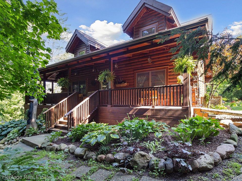 Welcome to your dream home! This authentic log cabin is nestled on 4+ acres with rolling hills and mature trees, giving you that up-north feel. This is such a sought after home that it was featured in MLive. The main floor of this home offers an open floor plan with vaulted ceilings in both the living room and dining room, a stunning stone gas fireplace, french doors that lead to your wraparound porch, and additional deck overlooking the pool and patio. The kitchen is spacious and provides ample cabinet/counter space, granite countertops, and stainless-steel appliances. The main floor also has 2 bedrooms, 1 full bath, and laundry room. The gorgeous custom log staircase leads to the loft with vaulted ceilings/exposed trusses overlooking the living room. The master suite is also on the upper level and offers vaulted ceilings/exposed trusses, a walk-in closet, and private full bath with a jet tub and walk-in rain shower. The basement has an additional family room, full bath, and a sliding door that leads to a custom year-round pool/hot tub with a retractable roof and heated floors. The large, flagstone patio is adjacent to the pool and offers a custom fireplace, gazebo, and putting green, absolutely perfect for entertaining! Home also has a 21x26 pole barn, outdoor wood-burning stove with lean-to, hunting blind, creek, pond and so much more.