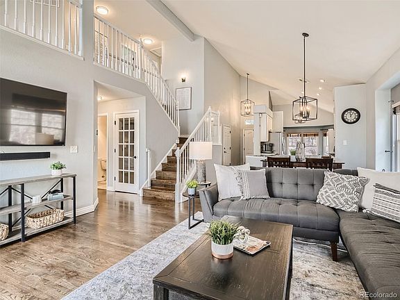You will not want to miss this immaculate, move-in ready 4 bedroom/4 bath home in the Conservatory neighborhood! No detail was overlooked when updating this home. As you enter, you will be greeted with vaulted ceilings, beautiful engineered hardwood flooring throughout, and tons of natural light. The kitchen has been updated with granite countertops, painted cabinets, new hardware, backsplash, and stainless steel appliances. (All appliances included in the sale and the fridge is brand new!) There is an eat-in kitchen nook as well as bar seating, and a formal dining area. The open-concept living room has a gas fireplace to enjoy during our Colorado winter months. The main floor also includes the primary suite complete with updated 5-piece bathroom and walk-in closet. Laundry and another half bath located on the main floor as well for convenience. Upstairs you will find a loft area, 2 additional bedrooms, and a full bathroom. The finished basement is an entertainer's dream! Theater projector, screen, and surround sound included with the home! The walk-out basement also includes a large bedroom with en suite bathroom, and an office with a wet bar. Mini fridge included as well! Plenty of space to store your cars and personal items in the 2 car attached garage. You will have year-round privacy to enjoy your deck and patio in the backyard with evergreen trees backing to greenbelt and trails. Hot tub hook-ups are already installed. This home is close to restaurants, shopping, and trails. Within walking distance of the local highly-rated elementary school which offers free after-school childcare. Other Updates Include: Kitchen and bath remodels (2019), Permitted basement with additional bedroom and office (2019), new interior paint (2020), new exterior paint and deck (2022), New lighting (2022), New refrigerator (2023), Newer Roof (2018), humidifier, hot water circulator, new garage door opener and garage built-ins.