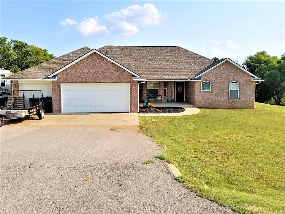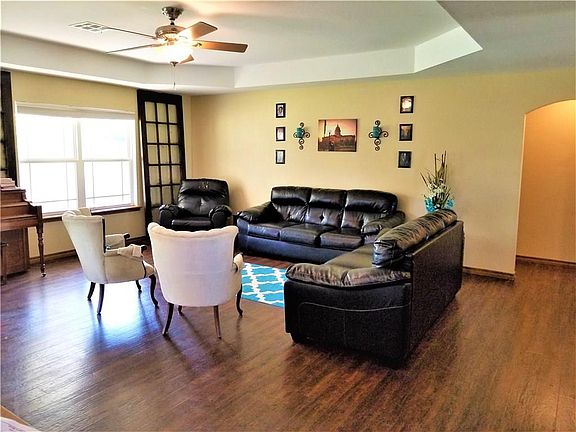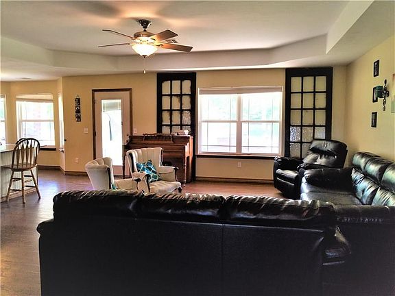 Great 4 bedroom home plus an office with the new barn doors rustic style ,large open kitchen opens to living room with granite counter tops and large breakfast bar between kitchen and living room. Wood floors throughout, carpet in the bedrooms only. Storm cellar in garage. has large covered patio with great view of pond and trees. Separate dog run with large shed. Tree house with hammock, slide, and sand box. RV parking has 50 amp electric and clean out.