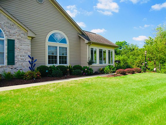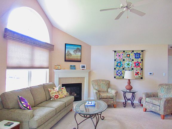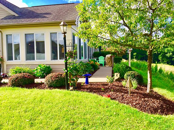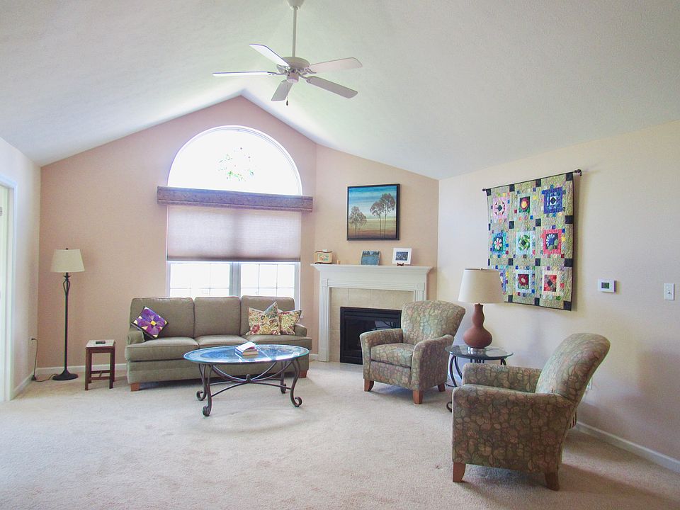 This carriage house/patio home features 2-3 bedrooms or den, 2 full bathrooms, cathedral ceilings, a gas fireplace in the living room, glass French doors to a sunroom, and flex room.