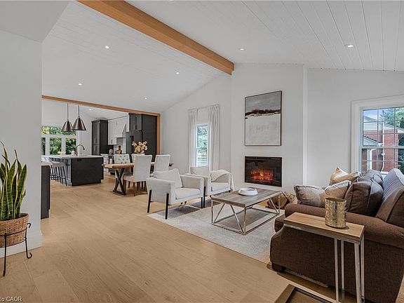 This stunning, fully and professionally renovated bungalow is ideally located in one of Central Burlington’s most sought-after neighbourhoods. Enjoy the ultimate in convenience. Just a short walk to downtown shops, restaurants, the GO Train, and the lake. Situated on an impressive 75' x 100' lot, this home blends luxury, functionality, and modern design. Step inside to a bright, open-concept layout perfect for both everyday living and entertaining. The main level features soaring 12-foot vaulted ceilings, wide 7.5” engineered hardwood flooring, a stylish entry with custom cabinetry, and a welcoming living room with a cozy fireplace that flows seamlessly into the dining area with built-ins and quartz counter. The custom-designed kitchen is a chef’s dream, showcasing quartz countertops and backsplash, premium Bosch appliances, plenty of solid wood cabinetry with pull-out pantry storage, and an oversized 10-foot island with seating for five. The main floor also includes a spacious primary suite with a walk-in closet and a luxurious ensuite bath, as well as a second bedroom and an additional 4-piece main bath. The fully finished lower level provides exceptional additional living space, featuring a recreation room with a bar, three generous bedrooms, a 3-piece bath, and a well-appointed laundry room. Step outside to an oversized backyard with a large deck off the kitchen, perfect for outdoor dining, relaxation, and entertaining. This home is truly move-in ready, offering premium finishes, modern upgrades, and a lifestyle of comfort and convenience in the heart of Burlington. Updates extend beyond the surface, including HVAC, electrical, plumbing, roof, siding, and more.