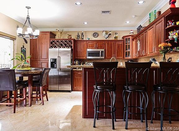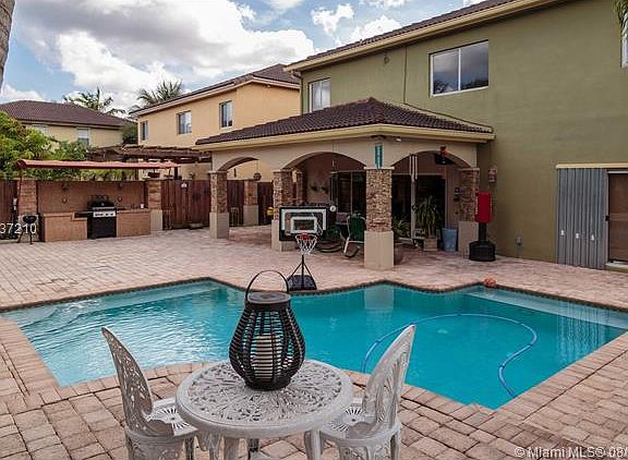 Two story Beautiful home to enjoy with your family and entertain friends. It is truly a beauty with a pool. No HOA! One complete bathroom and bedroom on the first floor perfect for in-laws or guest with separate entrance. Tiled throughout with wooden stairs. Master Bathroom has dual counters and the second bathroom has a spacious vanity. Granite countertops in kitchen and bathrooms. Stainless steel appliances. Side gate with space for a small boat. This property has high ceilings 2 AC units for energy efficiency. Beautiful terrace and bbq area with a built in counter. Paved throughout the patio and front. The property has security cameras and alarm system installed. Ample driveway when you have you have multiple guests. Dining Room Chandelier not included in the sale.