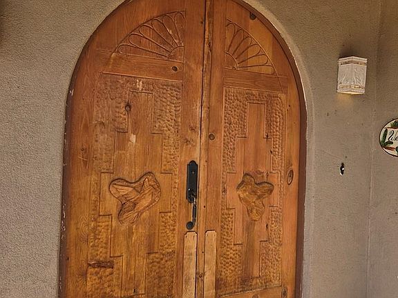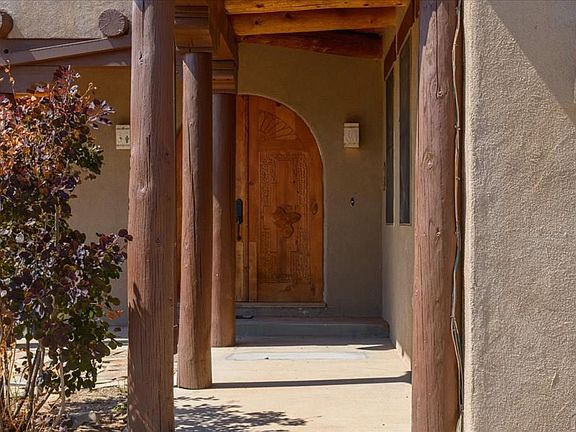 This one-owner custom Santa Fe–style home captures the warmth and character of the Southwest with its kiva fireplace, hand-peeled viga beams, wood latilla ceilings, rounded corners, and adobe-walled courtyards. Step up the stone path to a welcoming covered porch and solid wood front door that opens to a light-filled living room anchored by the fireplace and framed by large windows with mountain views. The open floor plan flows into a beautifully appointed kitchen with granite countertops, custom cabinetry, tile backsplash, and stainless-steel appliances, along with a charming breakfast nook that opens to the larger courtyard—perfect for morning coffee or evening gatherings. A formal dining area sits just off the kitchen and family room, separated by an adobe-style wall with generous windows for natural light. The spacious primary suite features French doors leading to a private courtyard with stunning mountain views, a walk-in closet, and a fully remodeled bathroom with a freestanding soaking tub and walk-in shower. Two additional bedrooms, each with walk-in closets, share a beautifully updated full bath. Set on a one-acre corner lot with native junipers, prairie grass, and wide-open skies, this home offers the tranquility of the high desert with all the convenience of Pueblo West living.