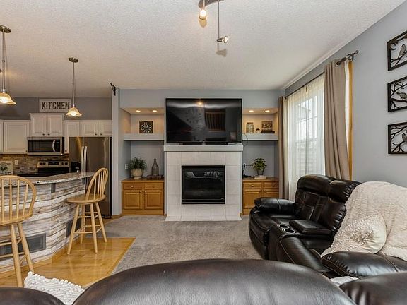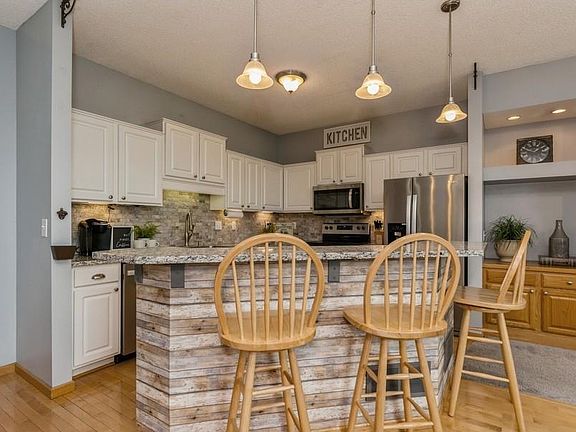 Light, bright and open! Gorgeous kitchen with white cabinetry, granite counters, tile backsplash, stainless steel appliances, undercabinet lighting, center island and hardwood flooring! Living room boasting a cozy gas fireplace flanked by built-in shelving and walk-out to the deck. 2 bedrooms on the upper level including the primary suite w/walk-in closet and private bath featuring a jetted tub, separate shower, dual sinks and brand new LPV flooring. Convenient upper level laundry. Fabulous lower level storage room. Large deck for grilling/entertaining. Walking distance to parks, restaurants, library and downtown Lakeville. 194 schools!