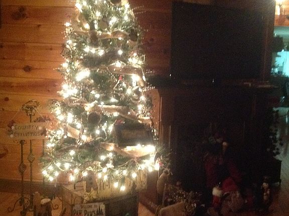 Log siding, metal roof, large front porch.