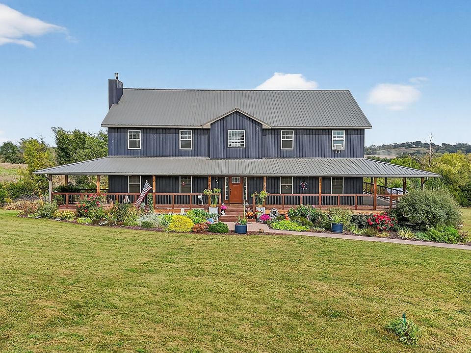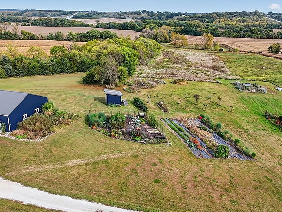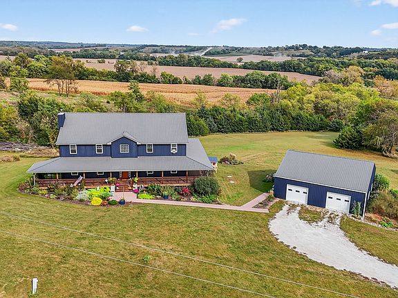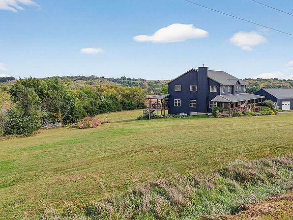 You will love this gardener's dream just 22 minutes south of Mills Civic Pkwy. This nearly 7-acre homestead features a 40x40 garage/outbuilding, 12x12 garden shed, fruit trees, asparagus, berries, herbs, plenty of garden space for spring and summer vegetables, and lush perennial beds. This home is spacious with over 4800 sq ft of finished space and a wraparound porch perfect for sunrise, sunset, or taking in the amazing views! The kitchen is a cooks dream, with large appliances, quartz countertops, large walk-in pantry, and plenty of cabinets and storage. The main level has massive ceilings, wood stove in the living room, dining area, and huge mudroom with laundry and utility sink. The 1st floor primary bedroom has french doors that walk out to the wraparound porch, 9 ft ceilings, walk-in closet with custom shelving, and a private bath featuring a walk-in tiled shower and double sinks. Main level also has a second bedroom/office and charming bath. Upstairs has a loft and three spacious bedrooms with more generous closets, a full bath, and is wired for zone heating. The walk-out basement offers two more bedrooms, reclaimed finishes of barn wood and tin, and potential for an apartment or in-law suite with private entrance and patio. Geothermal heating and cooling too! Call today to make this Home Sweet Home!