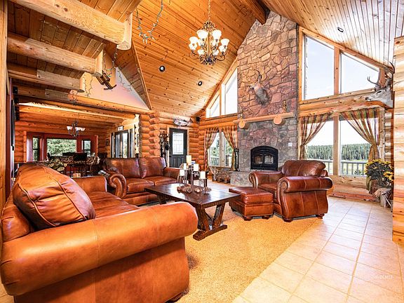 Custom full log home with most furniture included. Expansive Strawberry Valley views. Welcoming great room with over 20 foot vaulted tongue and groove ceilings, full southern exposure windows for passive heat and light. Featuring floor to ceiling massive stone accented wood burning Heat-N-Glo fireplace and half bath. Kitchen features GE Stainless Steel matching appliances including double oven, 5 burner gas stove, rough edge granite counters, quartz undermount sink, garden window, and Phelps Wood Designs custom cabinets throughout primary floor. Dining Room has exposed log beams bay window seat, French doors with sidelights bring in natural light. Main floor master suite French doors lead to the deck deck. Ensuite details frameless glass shower, travertine tile and jetted garden tub. Take in the amazing view on your full length covered and uncovered deck with log railings, beams and stone columns. Custom split log stairs lead to upper level's loft sitting area overlooking living room, two guest bedrooms and full bath. Lower spacious family room with built in entertainment center, dry bar, two bedrooms, 3/4 Bathroom and Whirlpool washer and dryer.