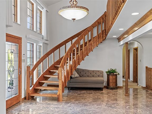 Welcome to this Exclusive Luxury ranch style home with breathtaking views on 6 acres, offering extravagant living with elegant custom designs. Be amazed as you enter a marble-floored foyer with a hand-crafted curved floating staircase. The interior boasts high ceilings, an upper loft overlooking the living area, an atrium with a built-in water feature, formal living rm with wooden beams, large family rm with stone fireplace, a cedar storage rm, kitchen with granite counters and an Italian chandelier. The master suite opens to a private patio. This home includes finished walk-out basement w/ a kitchen, living space, game rm, spa-like bathroom & add'l laundry, perfect for in-law suite or gatherings. The exterior boasts arched entryways, maintained landscaping, & a circular driveway. The highlight is pool area, complete w/ a slide & gazebo, & breathtaking views. This resort-like home blends luxury, comfort, & elegance for a sophisticated lifestyle. Home Warranty Incl. Schedule tour today!