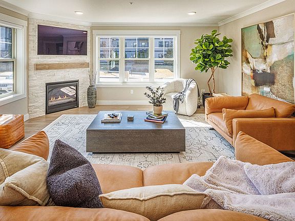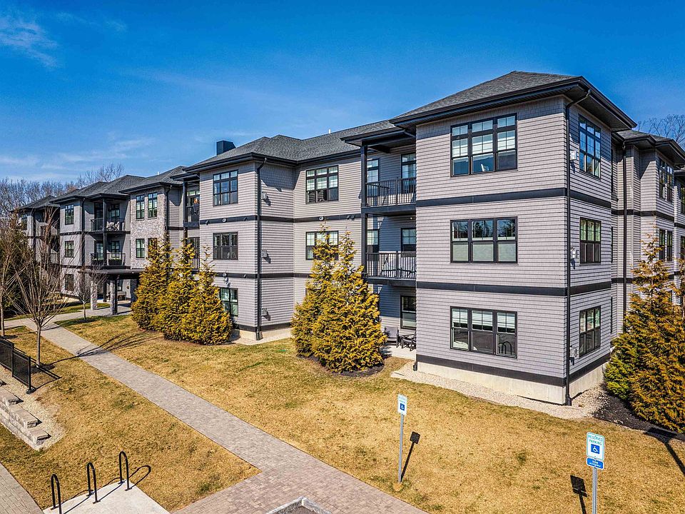 Welcome to one of Portsmouth's most desirable communities and enjoy the lifestyle of The Westerly! Enjoy one floor living in this former model home at ground level with a convenient direct entrance from the patio. Amazing natural sun light pours into this corner unit through the abundant amount of windows throughout, while allowing you to still enjoy the beauty of the mature trees that surround this corner of the building. This open space home was built to entertain placing the kitchen central with an over-sized island, GE SS appliances, quartz counters, and plenty of cabinets for storage along with a pantry closet. The kitchen opens directly to both the living room with a beautiful natural gas white ledge stone fireplace, and a built-in serving bar with shelving above and dining room. Appreciate the convenience of a private home office finished with a French door and custom wood trim and crown molding. Two generously sized, ensuite bedrooms. The primary suite can easily accommodate a king sized bed, the bath has double vanities and a walk-in tile shower. The roomy second bedroom includes an adjacent full bath. Convenient in unit laundry. In addition to the beautifully landscaped grounds, this home includes TWO deeded parking spaces in heated garage and private storage unit all conveniently located beneath the building, with elevator service, secure from lobby entrance, intercom service to the home. Minutes to shopping, restaurants, entertainment and beaches.
