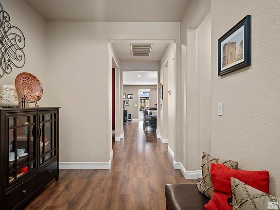 Meticulously maintained home in Cyan, conveniently located off South Meadows Parkway. Seller has spared no expense, this home is a must see for the ready to move in buyer. Impeccably maintained & well cared for this home displays beauty throughout. The spacious great room is perfect for entertaining while the fun extends to the backyard that is perfectly set up for hosting outdoor company., The laundry room offers counter space, cabinets and shelves. The primary bathroom provides a soaking tub, shower stall, dual sinks, linen closet & a walk in closet. All back yard furniture, decorations, grill and gazebo coverings, and fire pit convey with the sale. The kitchen fridge, washer* and dryer convey with the sale. There is a murphy bed with a matching cabinet/shelves in the front room that convey with the sale along with the closet built in. Cabinets in the garage stay along with the over head shelving. This home boasts many upgrades including exterior paint, garage floor coating & plantation shutters in '20, new water heater in '21, new slider & flooring in '22, new countertops, dishwasher and dryer in '23, fence was treated in '24. Also, new baseboards throughout. Dining room could be closed off and made into a fourth bedroom. *Washer pictured is being replaced with a new washing machine by August 2nd.