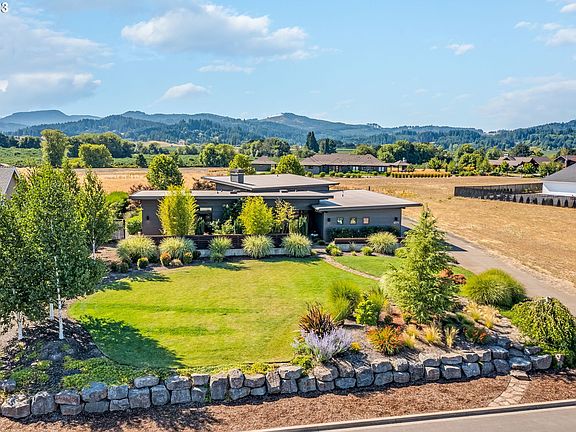Stunning contemporary home serenely set on half an acre in the beautiful Willamette Valley. The home sits on a quiet cul-de-sac in West Wind Estates with approximately 2446 SF and an additional 950 SF garage.Built by Kris Stubberfield, of Stubberfield Custom Homes, in 2017, this home features open plan living with an expansive view of the coastal mountain range and lush hills and farmland.Attention to detail at every turn: six panel La Cantina sliding doors, 8" wide plank white oak floors, Jeld-Wen windows, top of the line kitchen appliances, deep exterior clear cedar soffits, 2"x 6" construction, 5/8" sheetrock with no baseboards nor window or door casings and curved entry wall are just a few details that make this custom home truly one of a kind. The luxurious, yet comfortable finishes are exceptional, as well.The spectacular view through to the coastal mountain range and farmland is serene and hard to come by so close to town. Live in the heart of Oregon Wine Country and be minutes away in any direction to world class wineries, Historic Downtown McMinnville and easy access to Portland, Salem and the Oregon Coast!