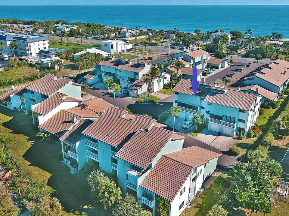 STEPS TO THE OCEAN from this TASTEFULLY UPDATED TOWNHOME: Hit the sand, go surfing or walk along the shore. Catch the prevailing SE sea breeze from your EAST FACING balconies & porch. Kitchen elegance abounds with Quartz countertops, Bosch appliances, plantation shutters, gorgeous custom tile & cabinetry. The open dining area features an adjacent balcony. There are 4 stylish bathrooms & a sunny living room w/updated FIREPLACE, built-in desk & shelves, a convenient ½ bath plus sliders to a balcony. Take your PRIVATE ELEVATOR to the master suite, sip a drink & enjoy the views on another balcony. The 2nd master features a walk-in closet & full bath, & the 1st floor flex space boasts a full bath & open porch w/pavers & an outdoor shower. Brand new AC & more (ask for full list). Head to the Indian River a few blocks away for boating, paddle boarding & fishing or relax, & enjoy the tropical community pool in this distinctive seaside community with unique architecture & newer tile roofs.