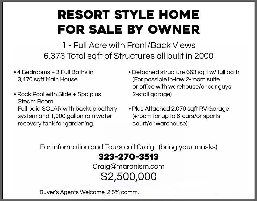 6,373 total sq ft of structures on one acre of secluded resort style living in tropical setting with front & rear yard views while secluded for privacy and security. Main home is 3,470 sq ft single story 4-bedrooms & 3-full baths and a steam room. Attached 2,070 sq ft RV garage fits a 40-foot diesel pusher RV & 6-full size cars together that is finished with options for tennis, racketball, basketball, or a warehouse. Detached 663 sq ft office with full bath and a 2-car garage/warehouse/ or could be 2-room suite with full bath & kitchenette options that is already central heat & air conditioning. MUST PREVIEW TO UNDERSTAND VALUE FOR YOUR BUYERS. Masked appts call to schedule 323-270-3513 Craig no listing agents please. 2 1/2% buyer’s agent commission paid when closed.