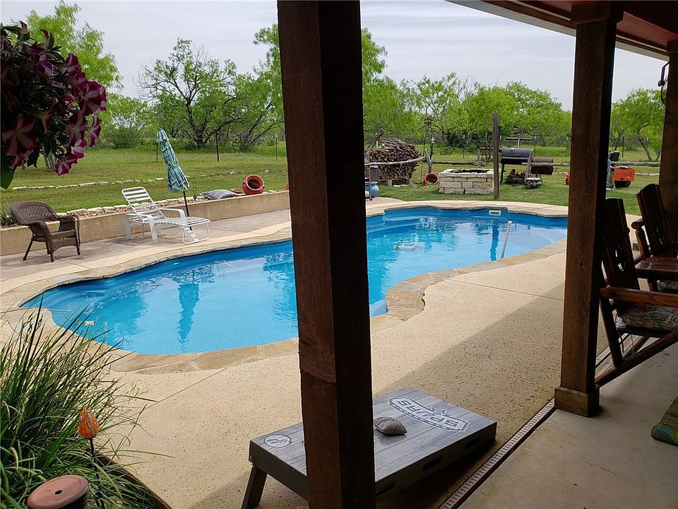 Gentleman's Ranch in the Heart of Texas. Stunning custom built home with an in-ground pool on 11 acres with AG exemption. Hunting allowed. Just minutes off IH-10 for commuters. 3 Spacious bedrooms + 2 Full Baths and ½ bath. Stained concrete floors. Master has sitting area and French doors to the pool and patio. Chef's kitchen with Double ovens, Granite counters, custom lighting, SS appliances. Tons of storage. Sit on the front porch and enjoy the wildflowers and fauna OR Relax on the back patio after a swim. Cuddle around the fire pit. Outdoor living options are boundless. Fresh eggs from an established flock. Park your boat or RV under the carport. TEXAS size living at it's BEST. Don't miss your opportunity to own a piece of Texas Heaven!
