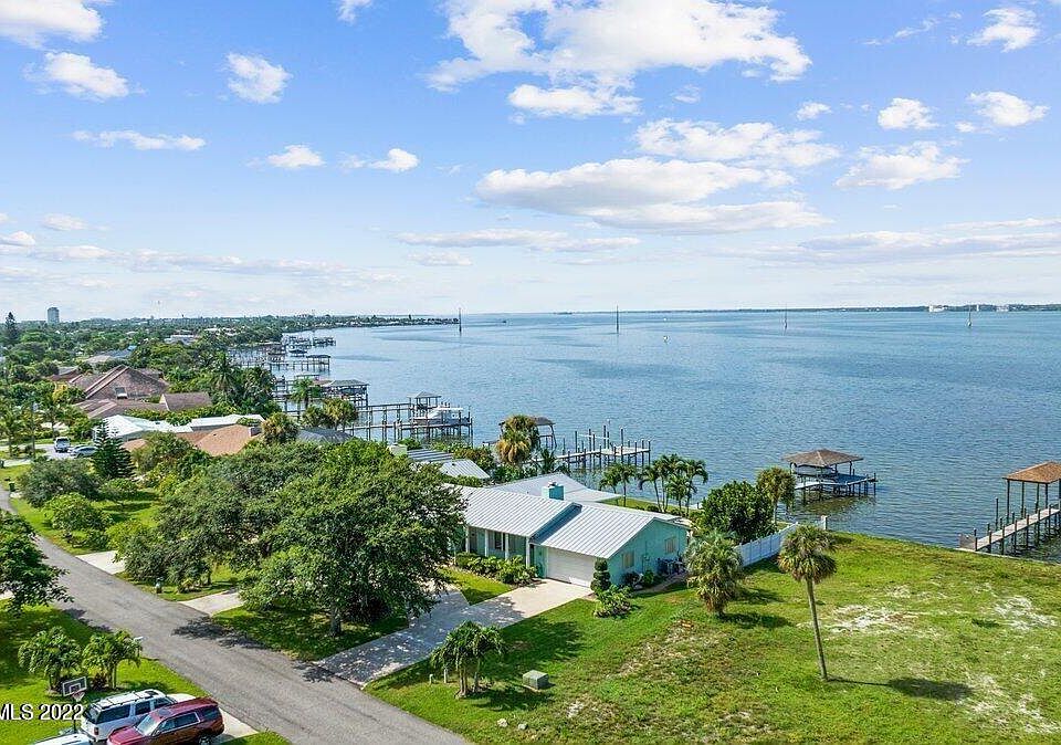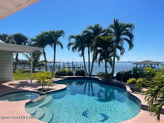 Waterfront home is situated in ideal location and boasts covered dock with lift for your boat. LOVE the stunning views of wide open waterway & sunsets! Heated pool and jacuzzi have new gas heater and has the best view of Indian River! SOLID seawall was replaced with vinyl and built to last! You will love the beautiful sunsets and views across the river. Very quiet neighborhood on a dead-end street. Metal roof is top of the line and replaced 2013. New hot water heater 2023. Except for circular window, all other windows + sliders have been replaced with insulated glass + are Miami-Dade approved. Miami-Dade approved steel panels are provided for circular window and 3 entry doors. Huge circular driveway and additional driveway offer lots of parking options. Community boat ramp to launch. Electric roll down shutters provide extra protection for the patio doors and screens. Aluminum un-rated panels can provide additional protection for the windows and screens. A large Miami-Dade approved Bahama shutter provides shade and additional protection for the master bedroom windows. The kitchen has been recently upgraded with a new granite countertop, sink, faucet and backsplash. The bathrooms have been upgraded with new vanities, granite countertops, sinks, etc. Tile floors in the living areas, laundry room and bathrooms. Vinyl plank flooring in the master bedroom. Carpet in the other 2 bedrooms. The 2 car garage is extra deep (31') providing lots of storage or work space.
