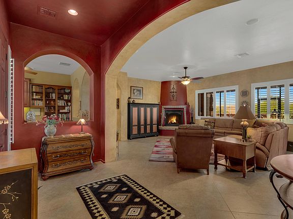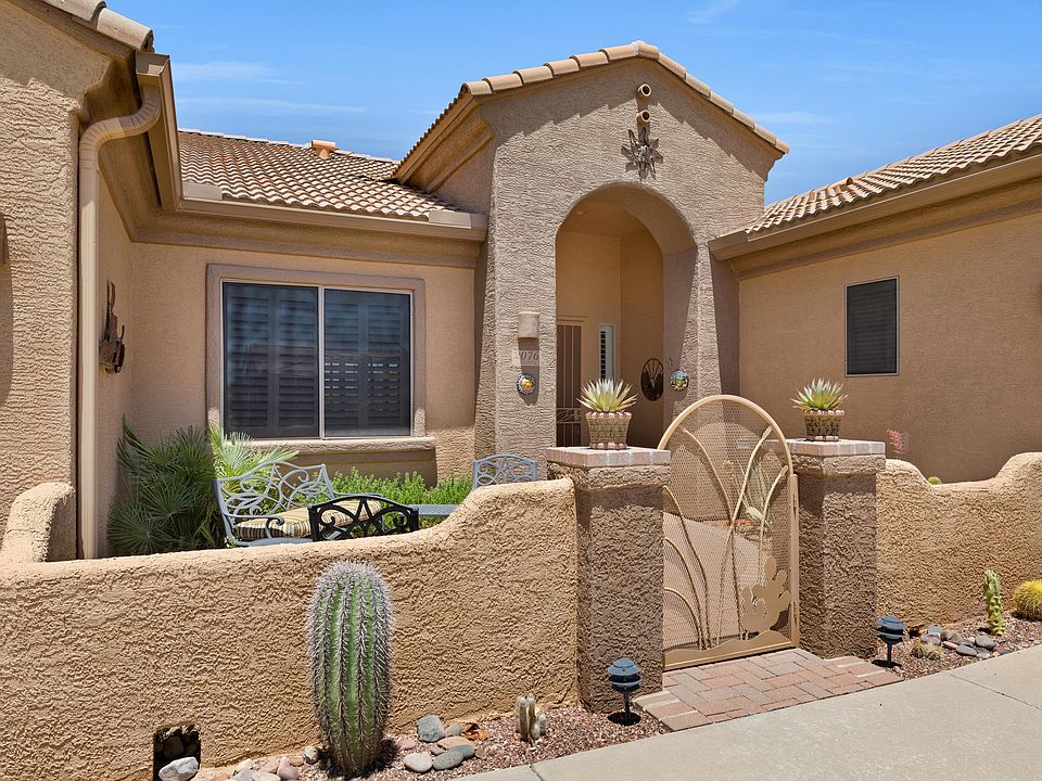 An absolute stunner in gated Canoa Ranch! The popular Dragoon floor plan with split bedrooms, great room, office (with an entire wall of built in shelving and desk area), formal dining, beehive FP, AZ room and 3rd car garage! This immaculately maintained home shows beautifully! Enjoy your front courtyard for morning coffee, relax in the backyard listening to the fountain cascade into the pond or music from your speakers in the AZ room. You'll love the Santa Rita mtn view while sitting at the built in bar and BBQ! The 3rd car garage features an entire wall of built in cabinets! Laundry room has built in cabinets and desk! Minutes away from the Canoa GVR rec center with indoor pool and pickleball! Custom shutters throughout (minus kitchen window). W/D & TV armoire neg.