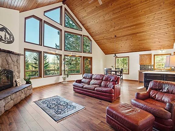 Gorgeous custom cedar home with panoramic views and open floor plan. Living room has vaulted knotty cedar ceilings and stone fireplace and leads out to a large deck. Kitchen has stainless steel appliances and walk-in pantry. Circular driveway, SolarGem greenhouse and 3-bay shop with heat. Private drive, well and septic, secluded setting in very desirable Silvercrest community.