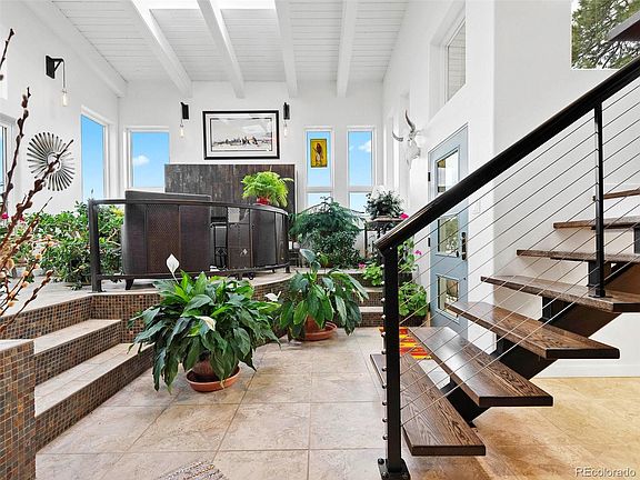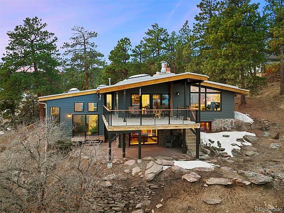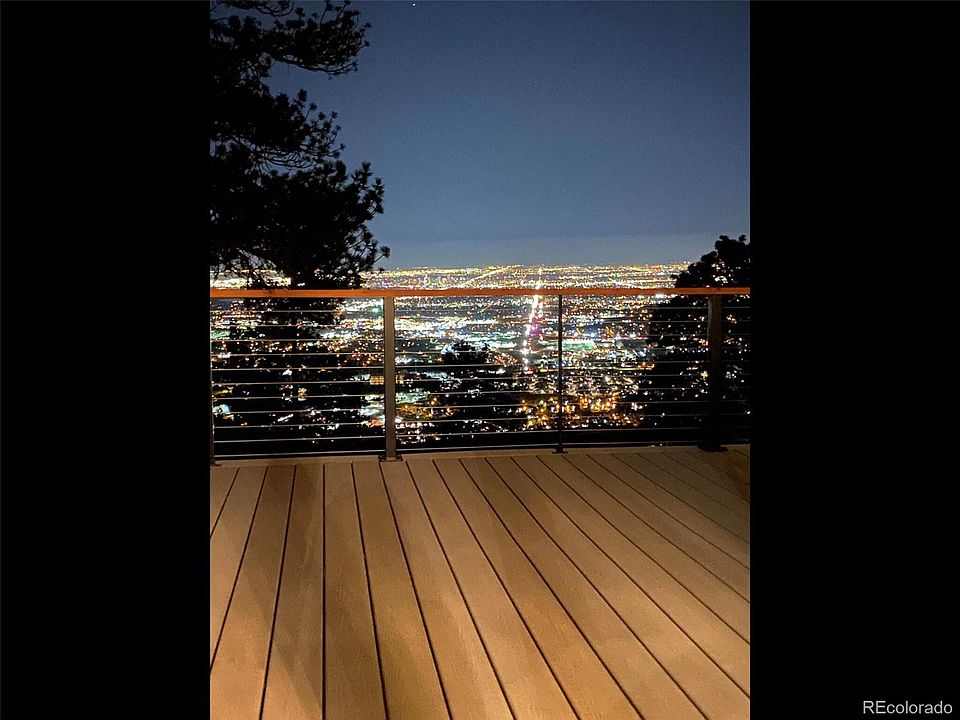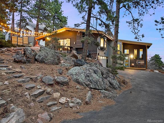 "Vista Brilliante" has a gated entry with a sweeping south-facing driveway that takes you away from the road to the best vantage point in Colorado to view city lights, fantastic sunrises, sublime moon rises & the ever-changing motion of metro Denver. The 1.25 acre site has gentle topography for creating an immense yard for kids & dogs, parking your RV & enjoying rare close-in foothills privacy & wildlife. Beefy flagstone steps lead to a circular flagstone patio with gas firepit that is super fun for entertaining with its far-reaching luminous city views! 1957 built home is extensively remodeled with new electrical, plumbing & every space touched with quality finishes. Pella windows are strategically located to flood the home with natural light & embrace the views that make this property so special. Architecturally interesting sky-lit interior has exposed beams & tongue-n-groove vaulted ceilings. 5 gas fireplaces, new blinds, Hardie board siding/stone accents, custom & dimmer switch lighting, swamp cooler for hot summer days & a custom deck drapery that closes to create a supremely private outdoor room are special features. Entry area is currently used as a sunroom & would make a lovely in-home office. Main level includes a gourmet kitchen open to the dining area, extensive hardwood flooring, living room with picture windows, primary suite with large walk-in closet, swanky 3/4 bath and access to tiered flagstone patios. 2nd main floor bedroom is across from sky-lit 3/4 bath. Lower level is ideal for guest privacy with its own living area, views, big bedroom & full bath. Double stairways make moving around the home easy plus provide a modern vibe. Close to area hiking/biking trails, the city of Golden via Lariat Loop & Mt. Vernon Country Club for tennis, swimming & dining, this unique property is ideal for smaller families or couples seeking a mountain retreat that never ceases to amaze! Xfinity/Comcast internet. 25 minutes to downtown Denver, 40 minutes to DIA.