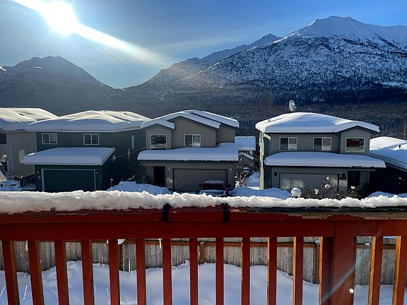 3 bed, 2 and 1/2 bath Multi-level home with vaulted ceilings, lg kitchen island, huge pantry & 2 separate living areas. Master BR, Master bath, guest bath & 2nd living area are all on top level. 2 car garage. Upgraded laminate flooring. Wonderful location in desirable neighborhood. Small, fenced back yard. Pets considered on case-by-case basis with additional fees. Mountain Views all around and nearby green space with hiking trail to river within walking distance, close to schools. Close to Ravenwood and Alpenglow Elementary schools. 20 minutes to JBER/Muldoon gate and 14 minutes to Richardson gate. 1 year lease minimum. HOA neighborhood guidelines must be followed. Owner pays HOA fees, water, and trash. Renter pays gas, electric, WiFi. Pets considered in case by case basis. Pet fee deposit and monthly fees will apply. No smoking (marijuana/tobacco). No on-street parking during winter months. Tenant responsible for snow removal, lawncare.