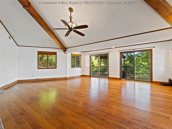Discover this beautifully unique hexagonal 2-bed, 1-bath home on a fully flat 1.49-acre riverfront lot along the Kanawha River! Enjoy an open, airy layout with a spacious deck showcasing stunning river views. A large detached garage—currently set up as a bar—can easily be converted back, while a huge car/RV port and an additional cinderblock building offer endless possibilities. With abundant yard space, ample parking, and unmatched charm, this riverfront retreat is truly a must-see!
