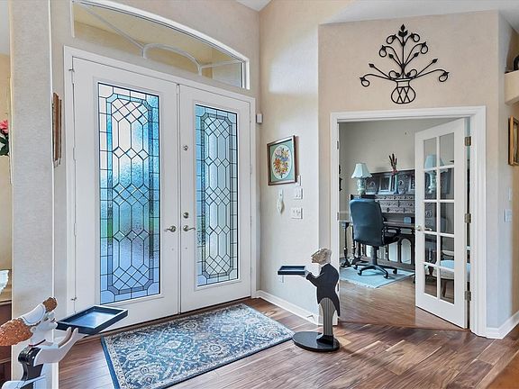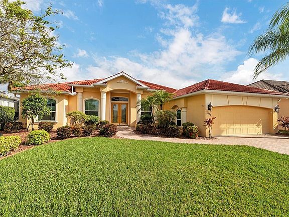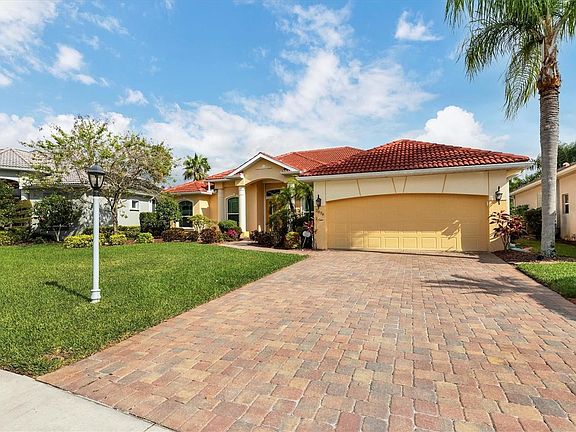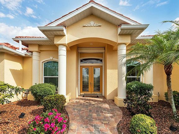 Gorgeous 3 bed/3 bath + den home. A beautiful 8' leaded glass double front door welcomes you into this beautiful custom build home. As you enter your eyes will be drawn to the large sliders and aquarium window that expand across the entire back of the home, so you can enjoy the natural light and awesome views. This home offers many extras, such as two master suites, lots of closets for storage, paver drive, oversized garage with golf cart parking and epoxy flooring. There is wood flooring in the main living areas of the home, granite and solid surface countertops, SS appliances, tray ceilings with crown molding, wood kitchen cabinets with pullouts, and hurricane protection includes both impact windows and shutters. AC replaced in October 2021. The master includes a slider and large window to enjoy the view from your bedroom, two walk-in closets, a roman shower, with separate garden tub, make-up counter and double sinks. The very large lanai offers an outdoor kitchen. The ample sized pool and spa were re-surfaced with pebble tech in 2017. The pool/spa is heated with gas (new in 2021), and solar. Bobcat Trail offers many amenities, such as a community pool, a tennis and pickle ball court, fitness center, community center with a small library and kitchen. Bobcat is conveniently located near US-41, I-75, shopping, restaurants, an immediate care facility, two baseball training stadiums (The Rays and the Braves) and is just 30 minutes from the beach. The CDD of $1839 is included in the tax amount.