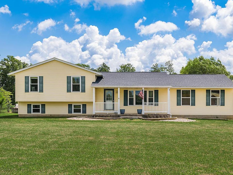 USDA approved! No down payment required. Nature lovers paradise! Escape to your private Oasis. Secluded & serene describes this one of a kind beautiful country home which sits back a long driveway on 5.21 acres. Kick back and relax on the spacious front porch. This 4 bedroom 2 bath split level home is very well maintained. The 1st floor features a living room, dining room, and kitchen w/ white appl & ss refrigerator. One level up is 3 bedrooms and 2 full baths. Down one level you will find another bedroom and an oversized family room which is great for entertaining. The 2nd level down is a large rec room as well as the utility room. The newly painted rear deck overlooks the wood swing set & park like yard. Two car garage w/ opener. Property has a chicken coop that stays with the property.