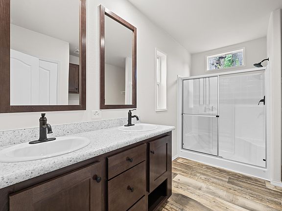 Sitting on a corner with a fully fenced yard, this home has what you are looking for. Enter through the cute covered front porch and into an open and bright living room that flows into a beautiful kitchen with tons of storage space. Down the hall, you will find two large bedrooms and a guest bathroom before walking into the extra-large primary bedroom with an attached bathroom. This house sits on one of the largest parcels in the park and includes many upgrades not offered in the other homes in this park.