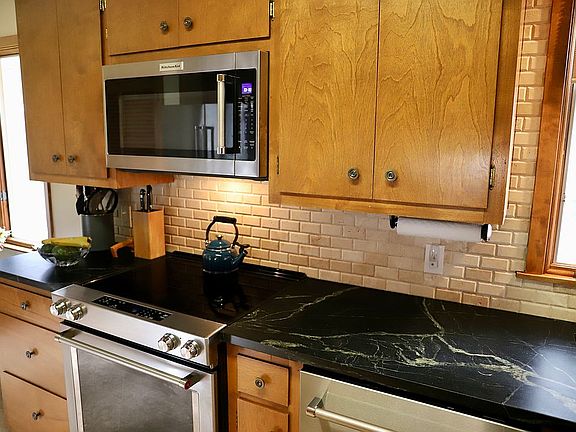 Well-maintained ranch with lots of recent updates and tons of growth potential, just off Windmill Park. Conveniently located within easy walking distance of downtown. 2 bedrooms, 3 bathrooms, 3 living rooms. Kitchen remodeled 2022 with high-end stainless steel KitchenAid appliances: dishwasher, microwave, convection range, and extra-large fridge. Gorgeous soapstone countertops do not burn or stain and are sealed for low maintenance. Ruvati workstation sink. New durable Armstrong Alterna floor. Ample storage with 28 cabinets in kitchen/laundry plus a pantry. Two of three bathrooms remodeled since 2020, including a custom travertine shower with linear drain and epoxy sealant for easy cleaning. New brushed nickel fixtures. All three bathrooms have walk-in showers. 50-year metal roof installed in 2018. Standing seam panels have no screw penetrations and are integrated into the gutters. 100% clover lawn was the talk of this year’s Tulip Festival. Lush growth chokes out weeds, doesn’t go dormant in summer, and improves the soil, yet doesn’t require spraying, watering, or mowing. New sidewalks poured in 2021. Driveway was replaced in 2014 to update Orangeburg sewer line to the street. Wheelchair accessible sidewalk leads to concrete porch and double entry doors. Landscaping rocks redone in 2023. Attached single garage with storage closet and upright freezer (negotiable). Second parking space off street. New egress window and window wells in 2023. House is on a smaller lot, with little back and side yard to mow. Basement is tiled and mostly finished, with a full bathroom, very large common room, and bedroom with two closets. Basement could also be used as a separate rental apartment with its own rear entrance and sidewalk. Main level has a living room and a second living-dining area. Living room could easily be converted to a second main-floor bedroom. 1368 square feet main level.