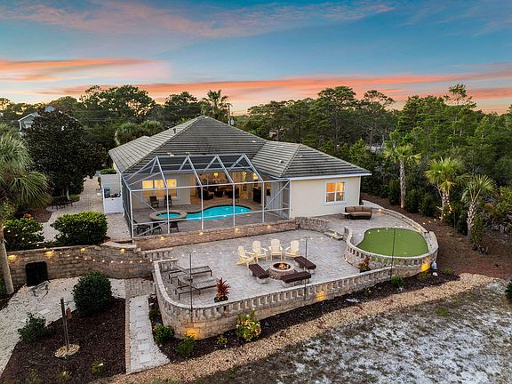 Discover your dream beach retreat where coastal charm seamlessly blends with golf course living. This beautiful home is nestled along the fourth fairway of Santa Rosa Beach Golf Club, just steps from the sugar-white sands of 30A. Designed for both relaxation and entertaining, this well-designed residence offers a private heated pool and jacuzzi, a summer kitchen, a putting green, and a built-in sound system that spans the entire property. Step inside to a spacious entry foyer that flows into the open-concept living area, highlighted by triple glass doors that open to the screened-in patio, perfect for embracing indoor-outdoor living. The remodeled kitchen is a chef's delight, featuring updated cabinetry, a wet bar, Bosch appliances, and a water filtration system. This thoughtfully designed single-story home boasts four bedrooms, including a luxurious primary suite with a newly renovated bathroom (completed November 2024) and a walk-in California-style closet, two guest bedrooms connected by a stylish Jack-and-Jill bathroom, and a versatile guest suite or studio with a private entrance off the patio for ultimate flexibility. Additional features include a dedicated home office with built-in shelving, a spacious laundry room, and a reinforced two-car garage along with hurricane-resistant windows, front yard lighting and hardscaping, and an irrigation system. This meticulously maintained property offers more than just a homeit provides a lifestyle. Located in a sought-after neighborhood with no HOA, don't miss this exceptional opportunity. Schedule your private tour today!