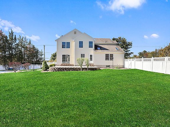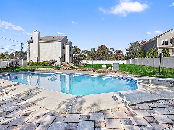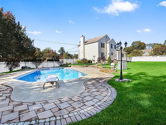 Terrific Price improvement! Just what you have been waiting for! A mint condition colonial styled home situated on over a 1/2 acre of fenced property.There's 'room to roam' at this home. Backyard is so impressive, beautiful lighting and what looks like an Olympic size pool w/brand new liner, custom paver patio too..Inside, two story foyer opens to wonderful kitchen with CI,under cabinet lighting, brand new refrigerator.FR w/cathedral ceiling and shining HW flooring.Additionally downstairs,formal DR & LR.Upstairs very spacious bedrooms, master suite w/full bath&soaking tub, shower,double sink.Brand new carpet highlights the freshly painted interior.Full finished basement adds so much living space..Great location for commuters, bus stops to NYC minutes away. It's a ''10''! Come see.