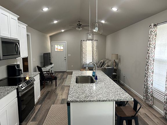 Like new home inside the city limits. 3 bedrooms 2 baths with open kitchen, living room, dining area with a cathedral ceiling, island that adds nice work space in kitchen, walk in pantry, all kitchen appliances convey. Spacious master bedroom with double vanity, spacious walk in closet. Exterior is vinyl siding, covered front porch with open deck on back.