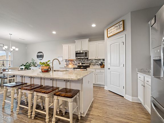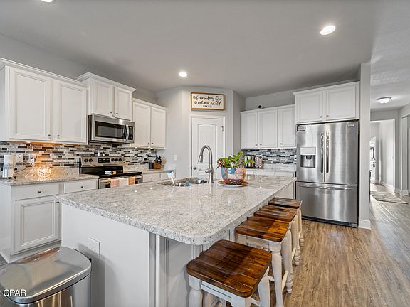 Do not miss this gorgeous 4-bedroom home (Delray floor plan) in the desirable neighborhood of Bridge Harbor. This community has it all: waterfront, unbelievable community pool and grill/community area, golf cart friendly and only 5 minutes from Tyndall AFB. This Delray floorplan home has all the EXTRAS: large yard, vinyl plank flooring, granite countertops, screened in porch, backsplash in kitchen, gutters, termite bond, security system, irrigation system, master bedroom equipped with 2 walk-in closets and so much more.
