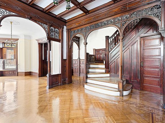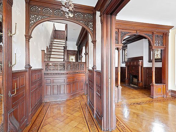 As you step into this home you will be blown away by the ornate staircase, woodwork and additional breathing taking period details which is rarely seen. The immaculate woodwork include mahogany wainscoting, custom paneling, crown moldings, pocket doors, bookcases, a beautiful pier mirror, original stained glass windows, fireplace mantels(5), built-ins and original parquet flooring; all in impeccable condition. The tastefully updated kitchen leads to the spacious deck that over looks the landscape finished backyard.