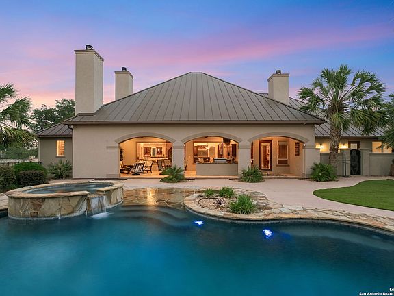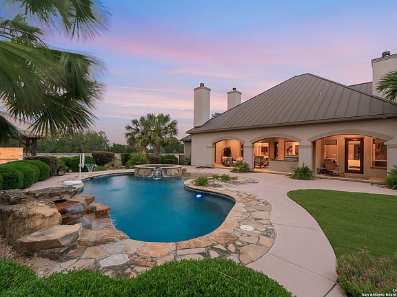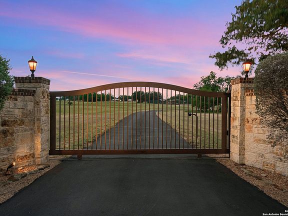 Welcome to this Texas Hill Country ~4,500 square foot resort living masterpiece, crafted by Cadillac Homes in 2009. Nestled on 9 tranquil acres shared with deer and majestic oaks, this gated retreat offers luxury and privacy. Relax on the screened porch by the sparkling pool, or in the soothing hut tub, and entertain on three private pickle ball courts- perfect for gatherings under starry skies. Enjoy dinner on a summer evening with your family in the outdoor kitchen and outdoor living area with fireplace. With custom arched stonework and soaring ceilings, this architectural gem blends timeless elegance and comfort. The gourmet kitchen has a pot filler, warming drawer, double ovens, gas cooking, granite island, and large walk in pantry. The en-suite master bedroom complete with a fireplace and outdoor shower access has a spa like bathroom with a separate shower and jacuzzi tub. This stunning estate offers two spacious secondary bedrooms each with it's own bathroom, a custom library with beautiful hardwood floors and paneling, an exercise room, wet bar, and so much more! No city taxes! 3 car garage. Just minutes from downtown Boerne, Geneva school, and San Antonio, your Hill Country sanctuary awaits! Schedule your private showing today.