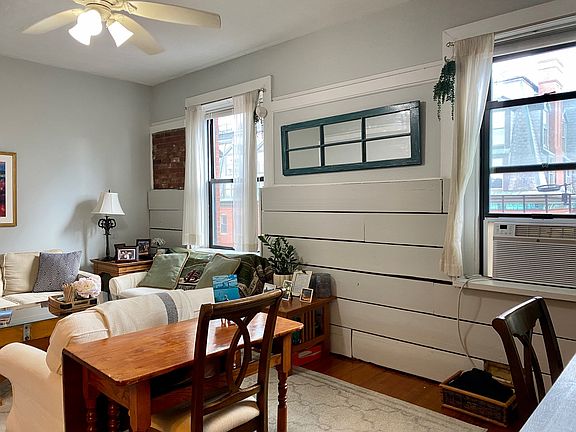 Move-in MAR 15: Unique, sunny, southern exposure, 4th floor apartment with lots of exposed beams and hardwood floors. Kitchen looks out onto a sun drenched living room. Plenty of nooks and crannies in this apartment that is loaded with built-ins and charm! Exposed brick gives this great apartment its final urban touch. Laundry in the basement. Heat, hot water & electricity are included. Sorry, no pets. Lease can be until 8/31/25 or 8/31/26. Photos from a previous tenant. Incoming tenant to pay 1 month broker fee. null
