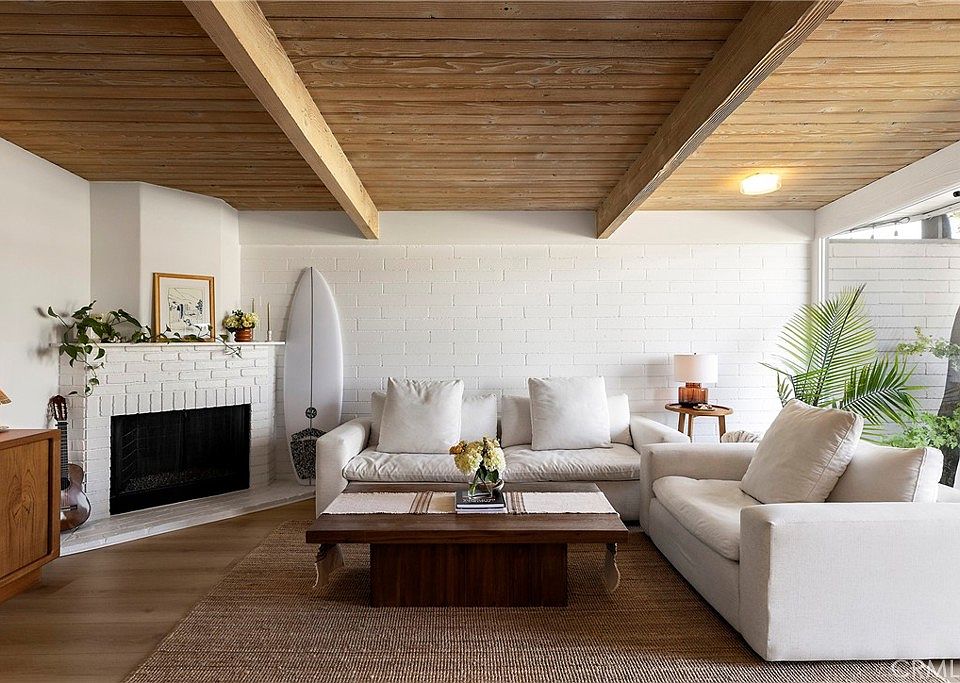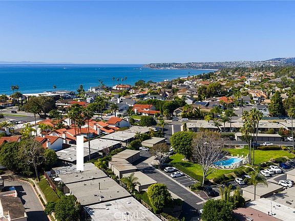 Ideally located near the beach in a dreamy mid-century enclave, this offering is absolutely stunning. Originally imagined in the early 1960s by renowned architect Chris Abel, these homes have been desired since. Upon arrival, an elevated & private patio welcomes you into this iconic single-level home with direct views of Saddleback mountain in the distance. Upon entry, it’s apparent this is one of the nicest options to ever come available in the community. Sandblasted ceilings lead you within the most beautiful great room. A unique & thoughtful approach to the floor plan centers the dining, offering a much more spacious family room. The use of different materials: painted block, wide-plank wood-like LVP flooring, agave-green shaker cabinetry, & large-scale windows including sleek upper gable windows for ample natural light, all create the most comfortable vibe inside. Newer stainless steel appliances, quartz counters, Walnut shelving, custom lighting, & fixtures and built-in storage all contribute to the upgraded appeal of the kitchen. A rare gas fireplace anchors the oversized family room finished in white brick, providing a cozy warmth throughout the entire open space. Two spacious bedrooms with vaulted ceilings, stylish draperies, newer carpet, ceiling fans, mirrored closet doors, & gable windows, both rooms offer the most relaxing place to wake up. The primary has a very private patio beyond accessed by sliding doors. This is another relaxing & sunny space to unwind outside. A newly-updated full bathroom with dual sinks, new vanity & fixtures with skylight services the home. Other newer values: central heater, water heater, solid-core shaker doors inside, casings & baseboards, stackable laundry, new paint & flooring throughout, one-car garage nearby + parking space, & its ideal location. Reminiscent of iconic mid-century Eichler-esk design, the neighborhood consists of 54 homes centered around a private solar-heated saltwater community pool & center. Very close to the ocean with nearby access to sandy beaches, a paved beach path runs north to south from SC to DP along the coast highway. Several restaurants, cafes, beautiful beaches and fun surf spots along the way, the SC Pier & beach trail, & easy access to the DP Harbor - currently undergoing a major renovation (value add for the entire area). This location offers an ideal central point to both cities. These mid-century homes within the Vista Del Gado are a special offering rarely available.