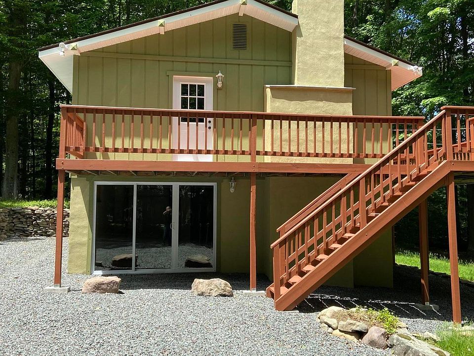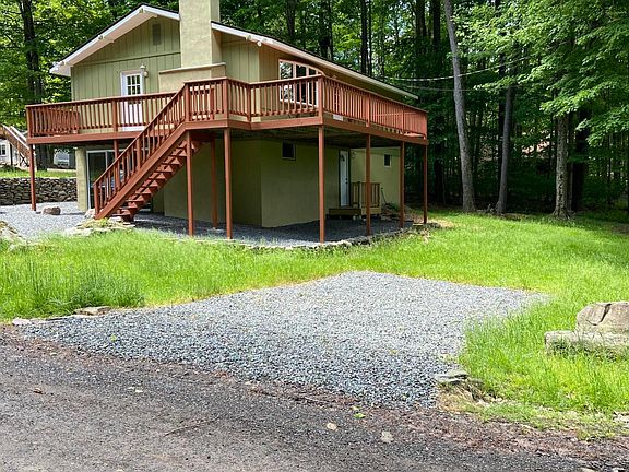 Newly Remodeled Raised Ranch is Exquisetly finished with a miticulous touch.Has a panoramic view of the Lake 7 Months out of the year. Just a short distance from the Beach and the lodge. This 3 bedroom 1.5 bath home is located in a well established section of this gated community. Featuring 3 heated pools and 4 beaches with playgrounds as well as an island dedicated to recreation. Feel the Poconos when you relax by an authentic real stone fireplace surrounded by Real wood paneling ( the good stuff). This getaway includes New granite counter tops, stainless appliances, cabinets and fixtures. New state of the art plumbing and all new wiring. Laminate flooring gives the home that clean fresh feel. The interior doors are solid wood raised panel. With the turn of a key you'll feel the quality!