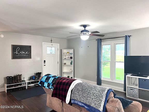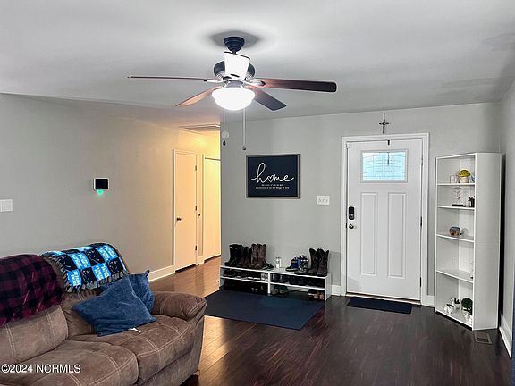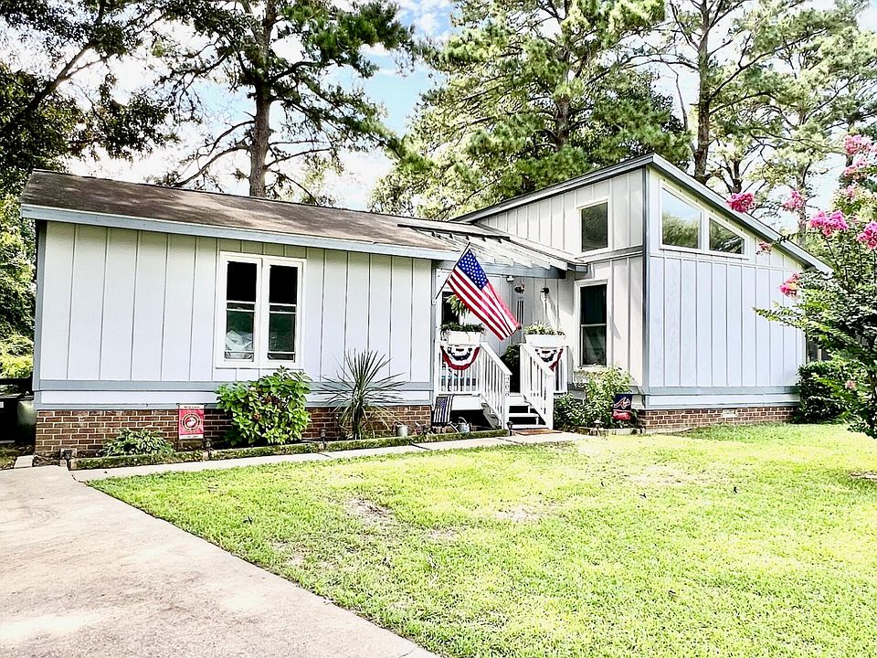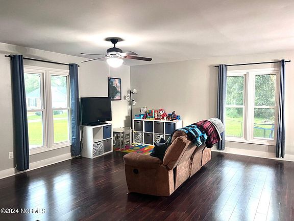 This well-maintained 3-bedroom, 2-bathroom home offers just under 1,300 square feet of thoughtfully designed living space. The kitchen boasts granite countertops, stainless steel appliances, white cabinetry, and a sleek subway tile backsplash. The open floor plan extends into the living and dining areas, which are accented by durable wood laminate flooring. The master bedroom is bright and spacious, featuring a vaulted ceiling, an abundance of natural light, and a ceiling fan for added comfort. The ensuite includes a white vanity with a granite countertop, tile flooring, and a tiled shower. Both guest bedrooms are equipped with ceiling fans and cozy carpeted floors, while the guest bathroom features a beautiful cherry vanity, granite countertops, tile flooring, and a tub-shower combination. The fenced backyard offers a private retreat with a large wood deck perfect for relaxing or entertaining. This property can also accommodate chickens and goats, adding a unique opportunity for those interested in a bit of homesteading. Conveniently located near Camp Lejeune, shopping, and dining options, this home is ready to be yours. Schedule your showing today.