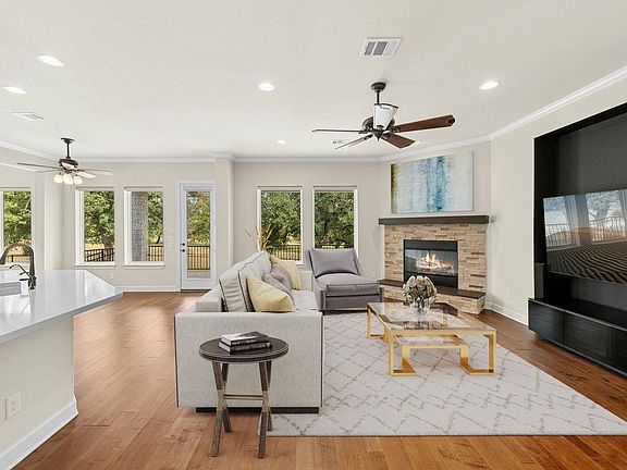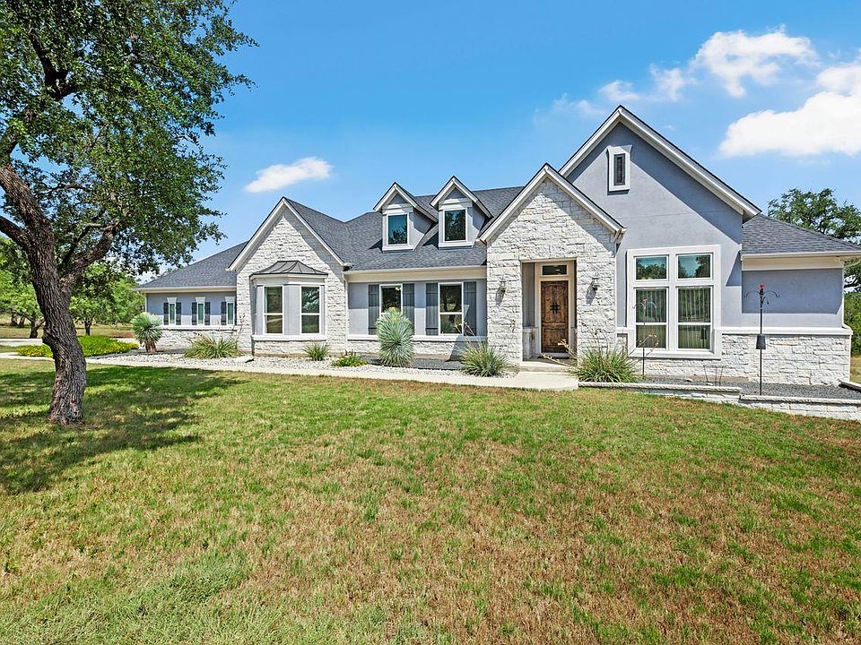 Tucked beneath a canopy of more than 100 live oaks, this stunning 2,730 sq. ft. David Weekley custom home sits on 6.89 spectacular acres in the sought-after gated community of Double Horn. The one-of-a-kind lot is cleared, private, has a lovely wet weather creek, and is at the end of a cul-de-sac. With modern upgrades and an easy flow for entertaining, the single story stunner blends Hill Country tranquility with everyday convenience. Inside, wide-plank hardwood floors, soaring ceilings, and natural light softened by custom Hunter Douglas automatic shades create an inviting ambiance. The chef’s kitchen boasts high-end Stainless Steel appliances, a generous island with space for seating, and seamless connection to open living spaces. Gather in the family room around the focal point fireplace on cool evenings. Host holidays or gatherings in the spacious dining room. Work from home in the separate front office with French doors for privacy. Ceiling fans throughout, deep crown molding, a built-in Ring system, and a thoughtfully designed 3-car garage with built-in cabinetry add comfort and practicality. Wrought iron fencing around both the patio and up close backyard area, plus a summer kitchen, enhances outdoor living. Beyond the home, Double Horn’s amenities elevate your lifestyle: a resort-style pool, playground, sand volleyball court, serene pond, and a pavilion with grills and stone fireplace for community gatherings. With tree-dotted landscapes, larger lots, and gated privacy, Double Horn is a rare balance of retreat and connection. Close to lakes, golf, wineries, hospital, services and shopping.