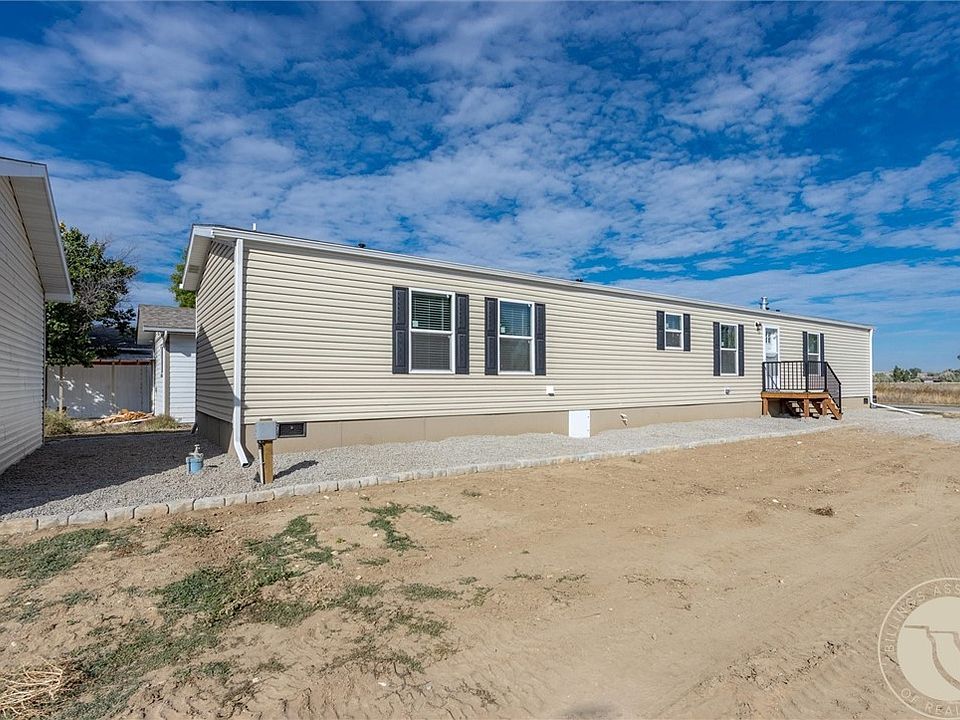 This 2025 manufactured home offers single-level living, set on its own lot with a permanent foundation & de-titled. Enjoy small-town living with quick access—approximately 20 minutes to Laurel & 30 minutes to Billings west end for shopping, dining, & amenities. The home offers an open-concept layout with a comfortable living space & electric fireplace. The kitchen features dark cabinetry, stainless steel appliances, & a large center island with plenty of prep space & room to add chairs for casual dining. Primary suite includes a walk-in closet & full bathroom with double sinks. Home includes 2 additional bedrooms & another full bathroom. House is equipped with a whole house ventilation fan & A/C. 24' x 24' detached garage with 10' ceilings—perfect for storage, parking, or a workshop. A great opportunity to own a brand-new home with modern finishes & functional design!